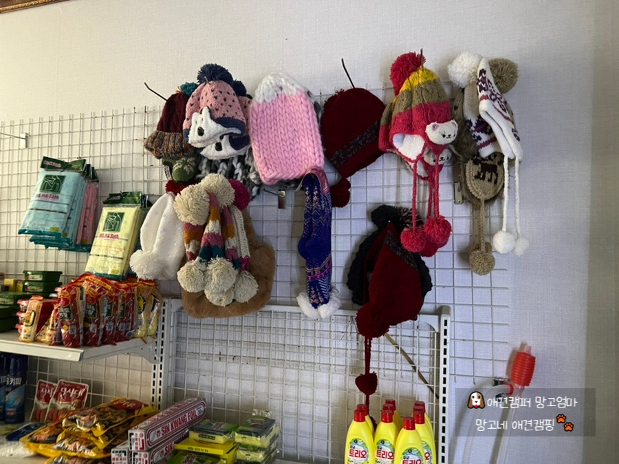 털모자도 있어서 깜짝 놀랐는데 저녁에 잘 때 너무 추워져서 왜 털모자가 있었는지 알겠더라고요.🤣 겨울이 되면 산속에 있는 캠핑장이여서 온도가 많이 떨어지는 듯 해요.
